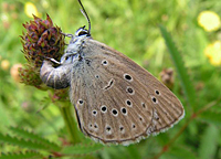 - The Dusky Large Blue (Maculinea nausithous) shows an interesting development. It lays its eggs only into the flowers of the Great Burnet. Here the caterpillars hatch, and in autumn they are carried by ants into their nest, where they hibernate. The caterpillars eject a sugar-containing secretion, but “clandestinely” feed on eggs and larvae of the ants. After pupation finally the butterfly hatches in the nest, and has to hurry up in order to leave the nest before being attacked by the ants. In the area the species is found e.g. in meadows close to Pittersdorf and Steinmauern, south of Elchesheim, west of Bietigheim and in abandoned meadows west of Wintersdorf. Read more