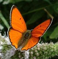 - Tangerine coloured with black margin and white fringes, these are the wings of the male Large Copper (Lycaena dispar). Recently it has been found along the flood dyke of the river Rhein. Its caterpillars feed on large dock species at the embankments of ditches and quarry ponds. The butterflies can be found on blossomy perennials (e.g. loosestrife, fleabane, horse mint, valerian). Read more